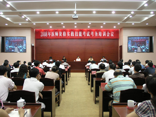 7月4日下午,市卫生局在行政中心浩然厅召开2008年度医师资格实践技能考试考务工作培训会议,局属医院分管领导、医政科长、市卫校、市疾控中心、市口腔医院三实践技能考试基地分管领导、考务工作负责人及本次实践技能考试全体考官参加会议。市卫生局胡丹副局长到会并作重要讲话。